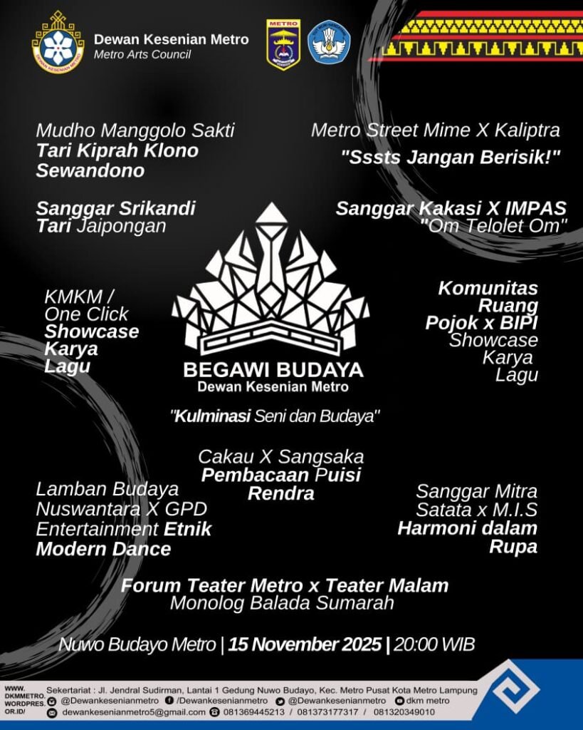 Metro — Pelaksanaan Begawi Budaya 2025 di Gedung Nuwo Budayo Kota Metro tetap berjalan seperti rencana pada Sabtu (15/11) meskipun hujan deras mengguyur sejak sore hingga malam hari. Seluruh rangkaian acara tetap dilaksanakan, termasuk kegiatan mural yang digarap Sanggar Mitra Satata / Sketsa Lampung di area bawah tangga dengan menggunakan media papan sebagai antisipasi cuaca.