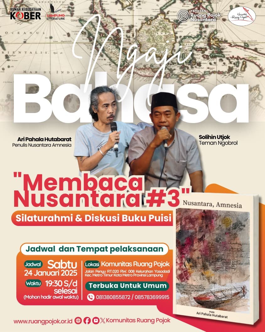 [Kota Metro, 17/01/2026] Komunitas Ruang Pojok bekerja sama dengan Lampung Literature akan menyelenggarakan kegiatan Ngaji Bahasa: Membaca Nusantara #3, berupa silaturahmi dan diskusi buku puisi Nusantara, Amnesia karya Ari Pahala Hutabarat.
