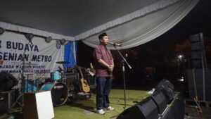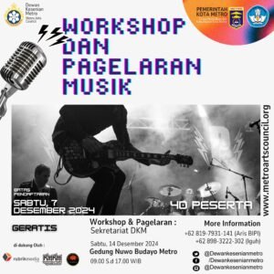 [Metro, 14 Desember 2024] Dewan Kesenian Metro (DKM) kembali menggelar Pagelaran Musik 2024 dengan meriah, yang berlangsung di Pusat Kegiatan Kesenian Pelataran Gedung Nuwo Budayo, Metro. Acara ini melibatkan peserta dari seluruh provinsi Lampung, dengan tujuan untuk membangkitkan kembali gairah musik di daerah tersebut.